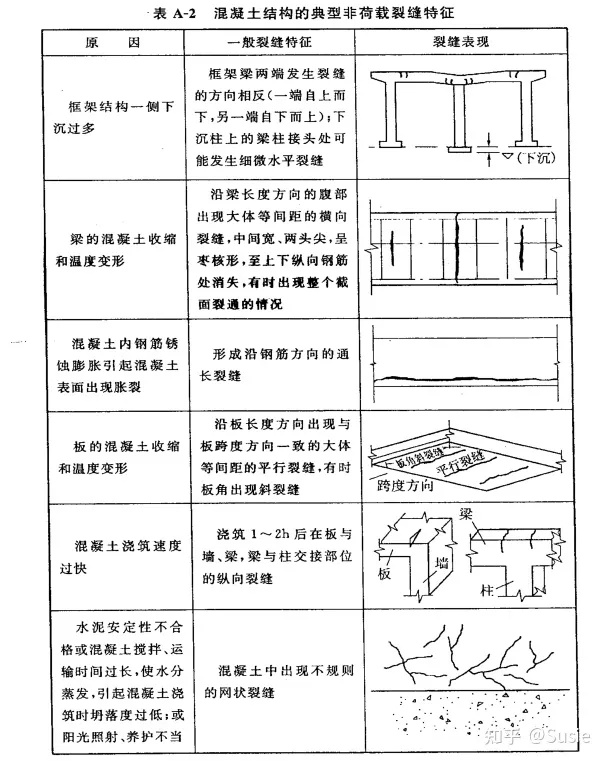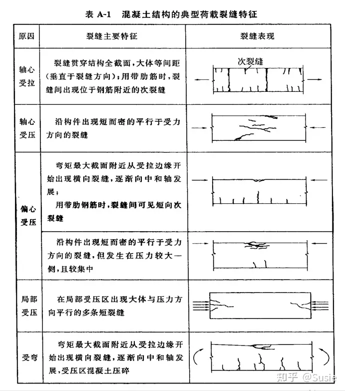 1. 荷載引起的叫荷載裂縫;典型荷載裂縫特征詳表A-1(源自CECS 293-2011)。2.非荷載因素引起裂縫叫非荷載裂縫(主要原因?yàn)闇囟?、收縮、膨脹、不均勻沉降等);典型非荷載裂縫特征詳表A-2(源自CECS 293-2011)。