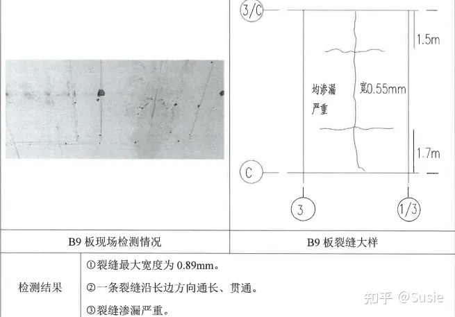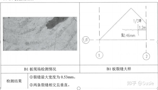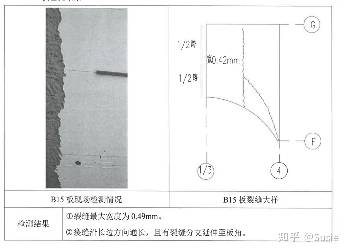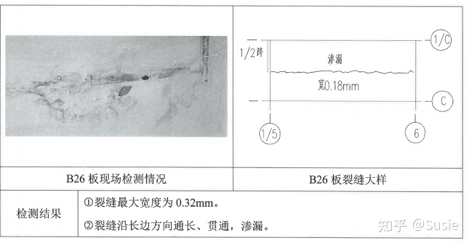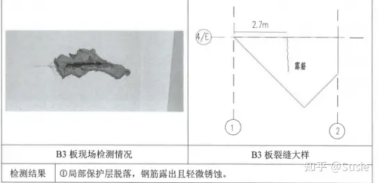 目前發(fā)現(xiàn)該車間屋面板存在裂縫、滲漏,鋼筋銹蝕等現(xiàn)象。板裂縫、鋼筋銹蝕及相關(guān)檢測(cè)結(jié)果詳圖1。